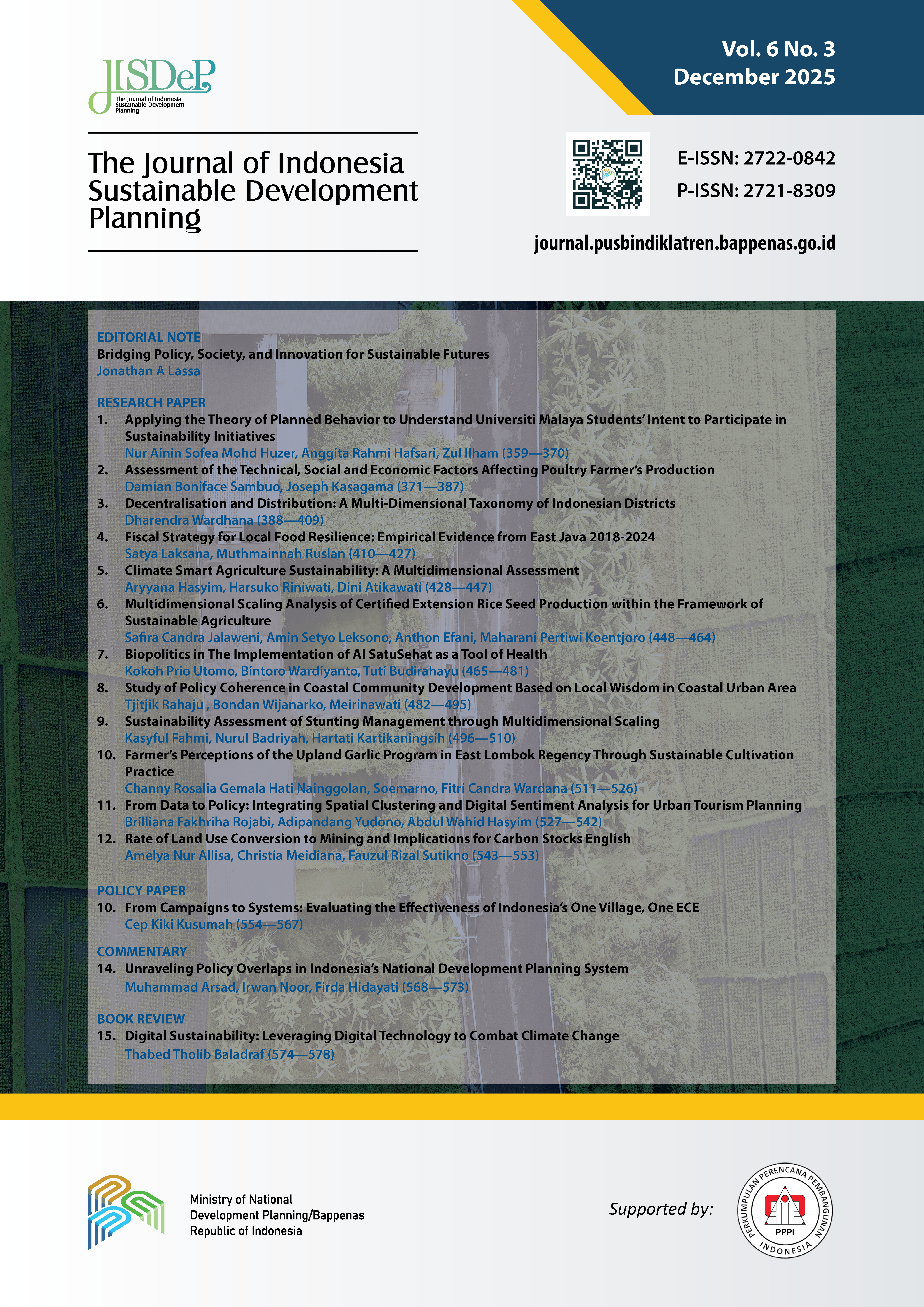The Journal of Indonesia Sustainable Development Planning (JISDeP) is a journal published by Centre for Planners' Development, Education, and Training (Pusbindiklatren), Ministry of National Development Planning/National Development Planning Agency (Bappenas) and supported by Indonesian Development Planners Association (PPPI). Article categories of this journal are research papers, policy papers, commentary, and book review.